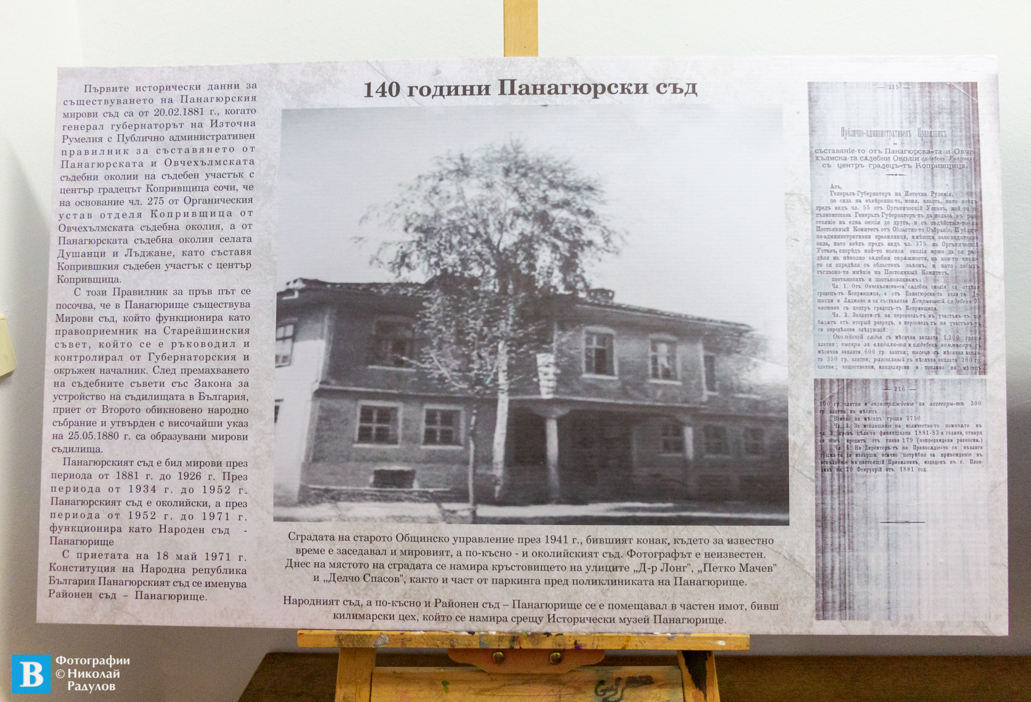 На 29 октомври във фоайетата на Панагюрския районен съд се откри фотодокументална изложба посветена на две кръгли годишнини на институцията – 140 години Панагюрски съд и 50 години Районен съд Панагюрище.