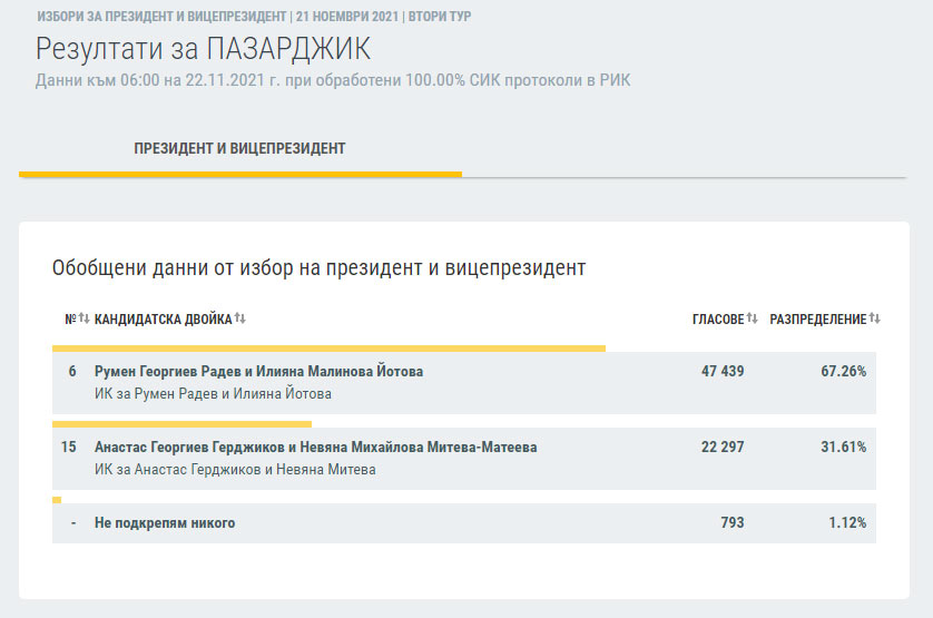 При обработени 100 % СИК протоколи в РИК-Пазарджик резултатите, от втория тур на изборите за президент и вицепрезидент, показват че кандидатпрезидентската двойка Румен Радев – Илияна Йотова печели вота с получени 67,26 % в областта. Другата кандидатпрезидентска двойка – Атанас Герджиков – Невяна Митева получава 31,61 % от гласовете на избирателите в областта. „Не подкрепям никого“ са отбелязали 1,12 %.