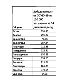 В края на 2021 година ИД Директорът на РЗИ – Пазарджик разпространи информация за нивото на заболеваемост в областта, изчислено спрямо 100 000 души население. Според тези данни областта през последния 14-дневен период е извън червената зона Това означава, че учениците могат да посещават училище без да се правят сутрешни тестове.