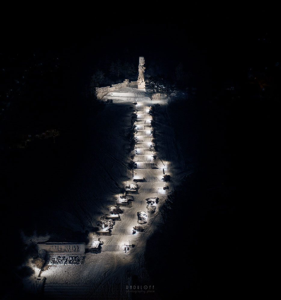 Погледнат от въздуха, Мемориален комплекс „Априлци“ има формата на кръст …