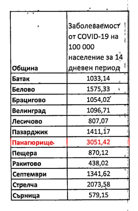С най-малък брой заболели в областта отново е община Ракитово – 438,02, като и тя бележи лек ръст в сравнение с данните от петък, когато броят бе 424,11,