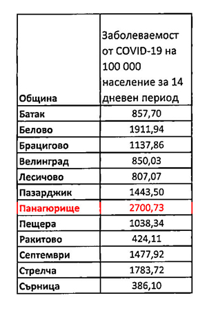 Заболеваемостта от ковид-19 на 100 000 души население за 14-дневен период в община Панагюрище е 2700,73, което показва лек спад. Данните са от днес, 7 февруари, и са част от ежедневната статистика, която РЗИ-Пазарджик изготвя. Броят им в петък бе 2878,35. Въпреки този лек спад в броя болни, община Панагюрище продължава да води класацията в областта, както се вижда от таблицата.