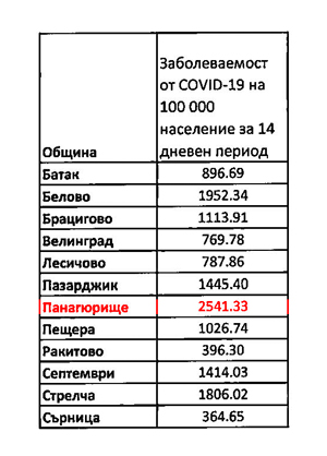 Заболеваемостта от ковид-19 на 100 000 души население за 14-дневен период в община Панагюрище е 2541,33, което показва лек спад. Данните са от днес, 8 февруари, и са част от ежедневната статистика, която РЗИ-Пазарджик изготвя. Броят им в понеделник, 7 февруари, бе 2700,73. Въпреки този спад в броя болни, община Панагюрище продължава да води класацията в областта, както се вижда от таблицата.