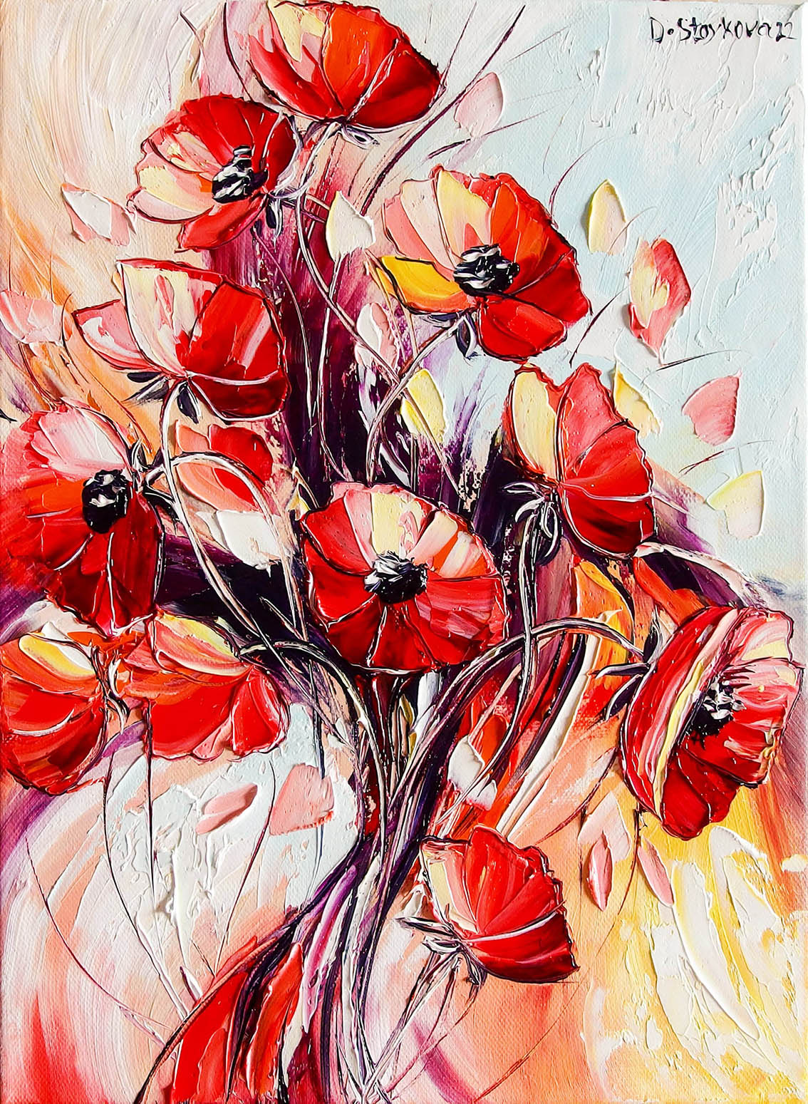 Чрез творбите си Д. Стойкова се стреми да зареди хората с позитивна енергия, с ярки цветове и красиви форми. Картините са пъстроцветни, релефни и запомнящи се, създават пролетно настроение и усещането за топлина и хармония. Те се отличават с оригинален и разпознаваем от публиката стил. Всички картини от изложбата са ръчно рисувани чрез пастозна техника с наслояване на боите с шпакла върху платно, което ги прави силно релефни.