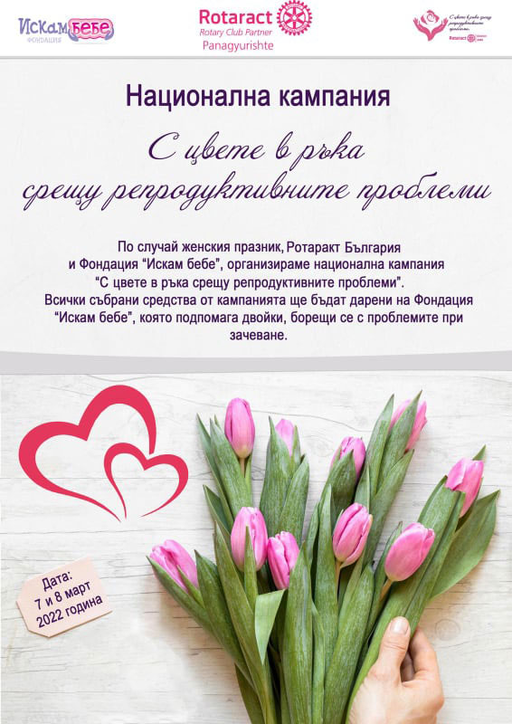 За втора поредна година Ротаракт клуб – Панагюрище организира своята кампания под надслов “С цвете в ръка срещу репродуктивните проблеми”. Тазгодишната инициатива е по случай Международния ден на жената 8 март и се осъществява заедно с Фондация „Искам Бебе“.
