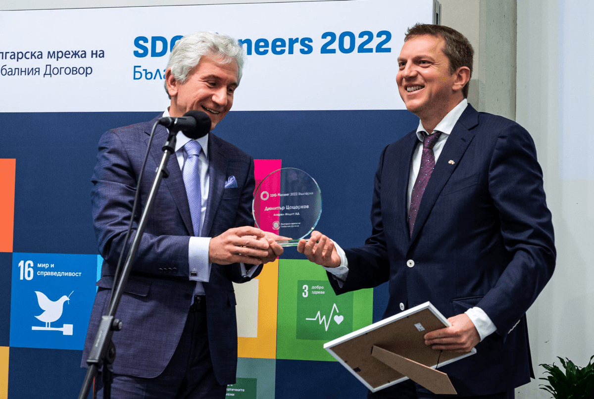 Председателят на Надзорния съвет на „Асарел-Медет“АД Димитър Цоцорков е първият носител за България на световните отличия SDG Pioneers 2022. Призът се връчва от Българската мрежа на Глобалния договор на ООН за активна дейност, която допринася за напредък по Целите за устойчиво развитие. Официалната церемония, на която бяха връчени отличията, се проведе на 15 март в „Техно Меджик Ленд“ – София. Димитър Цоцорков получи приза от Огнян Траянов, председател на Българската мрежа. На второ място в конкурса авторитетното жури класира „Уникредит Булбанк“, а представители на две компании с равен брой точки останаха на трето – „Загорка“ и „Контур Глобал Марица Изток 3″.