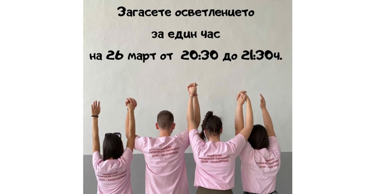 На 26 март, събота, от Общинския ученически парламент към ЦПЛР-Панагюрище ни призовават да се включим в „Часът на Земята“. В знак на съпричастност от 20,30 до 21,30 часа всеки може да загаси осветлението в дома си, както и ненужните електроуреди.