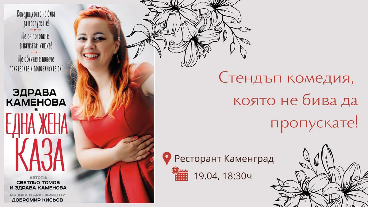 На 19 април Здрава Каменова ще гостува в Ресторант Каменград, за представи култовата дамска комедия „Една жена каза“, комедия, която не бива да пропускате!