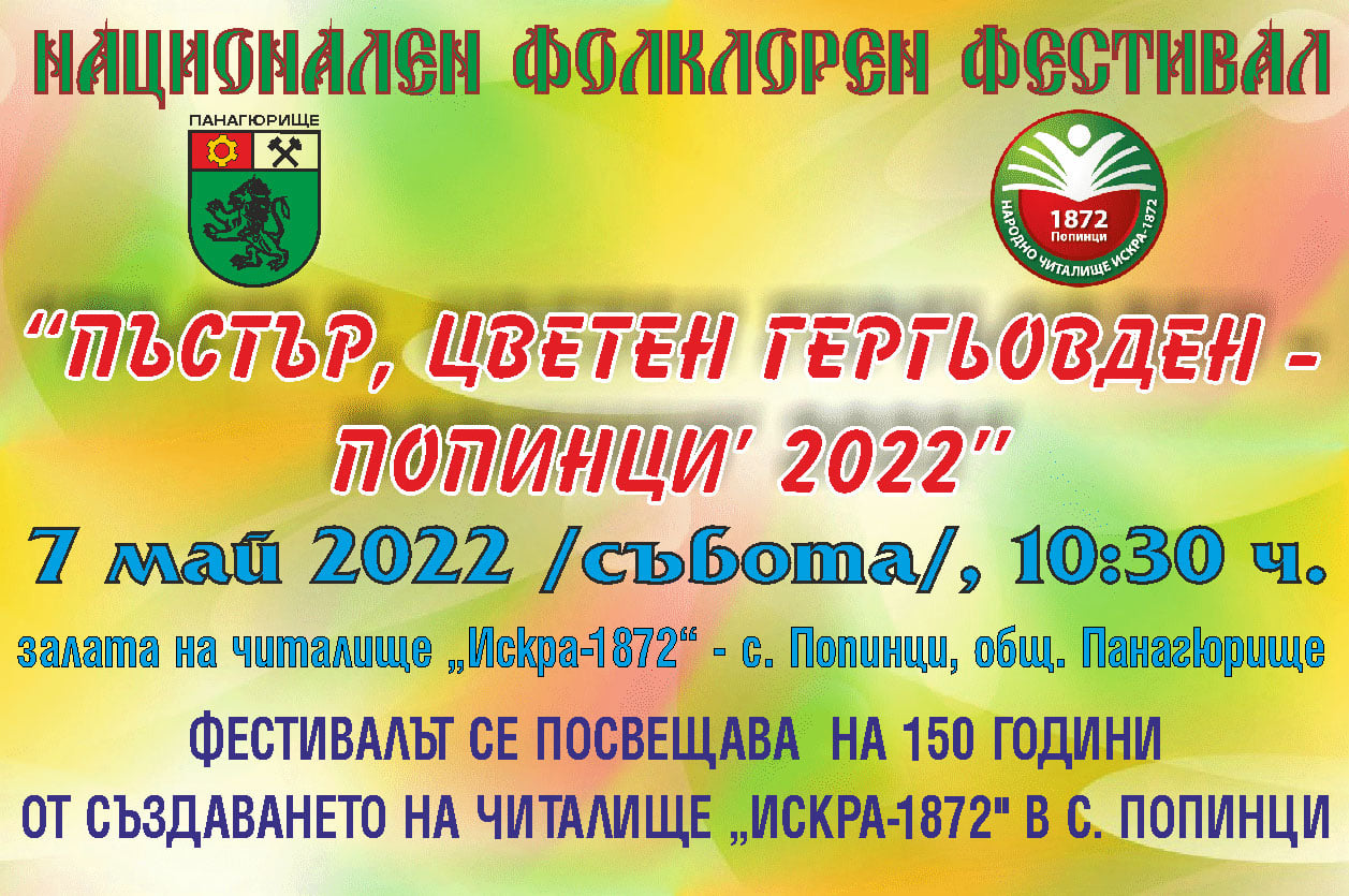 Настоятелството на читалище „Искра-1872” – с. Попинци кани жителите и гостите на община Панагюрище на Национален фолклорен фестивал „Пъстър, цветен Гергьовден – Попинци 2022” и отбелязване на 150-та годишнина от основаването на читалището в село Попинци. В тазгодишното издание на фестивала ще вземат участие общо 270 изпълнители, от тях 17 са групови и 7 индивидуални.