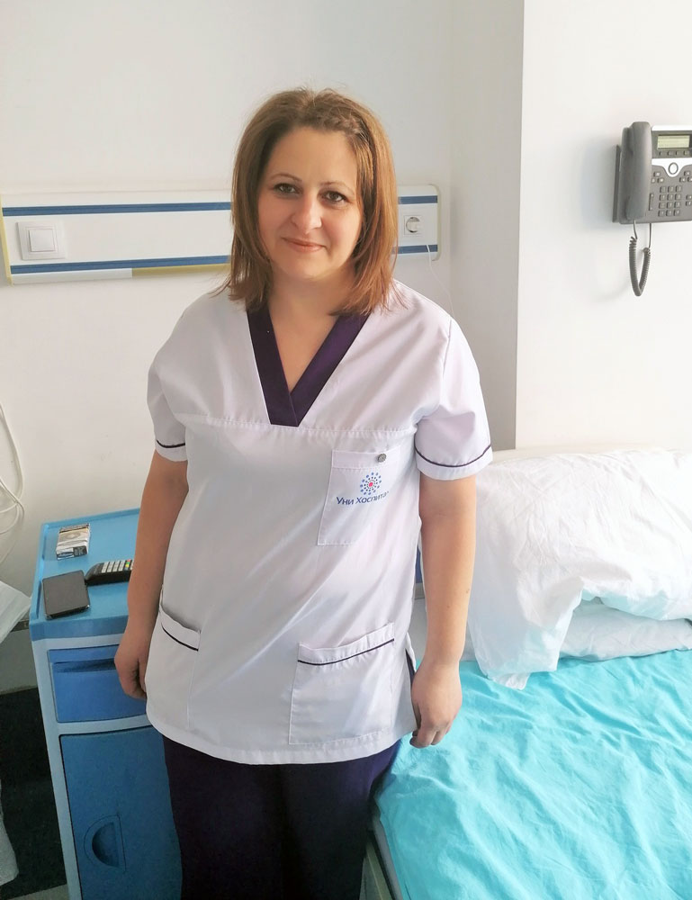 Дора Николова е старша медицинска сестра на Отделението по ендокринология и болести на обмяната в „Уни Хоспитал“ повече от 6 години. „Нашата професия дава изключително голяма възможност, ако искаш да се развиваш като човек, защото ежедневно имаш досег със страданието на хората и може да оцениш истински важните неща в живота“, разкрива ст.м.с. Николова. Спомня си, че в началото, докато учела ѝ било особено трудно да се справя с човешката болка, но никога не е съжалявала за избора си. Счита че е проявила прозорливост, предвиждайки дефицита на сестри. И за нас, и за пациентите, ще бъде по-добре, ако сме повече, обяснява ст.м.с. Николова и не крие съжалението си, че професията не е сред предпочитаните от младите хора. Подобряването на качеството на живот на диабетиците е основната цел на екипа, който работи в Отделението, споделя още старшата сестра. Особено се гордее и безмерно обича дъщерите си – по-малката все още е ученичка, но вече има интерес към медицината. За годините, в които работи в Панагюрище създава много приятелства – и с пациенти, и с колеги, и това ѝ помага, когато е далеч от дома си, който е в Стара Загора.