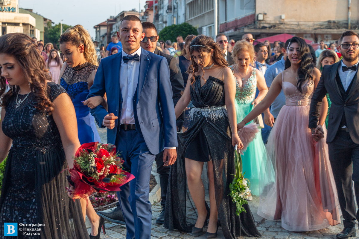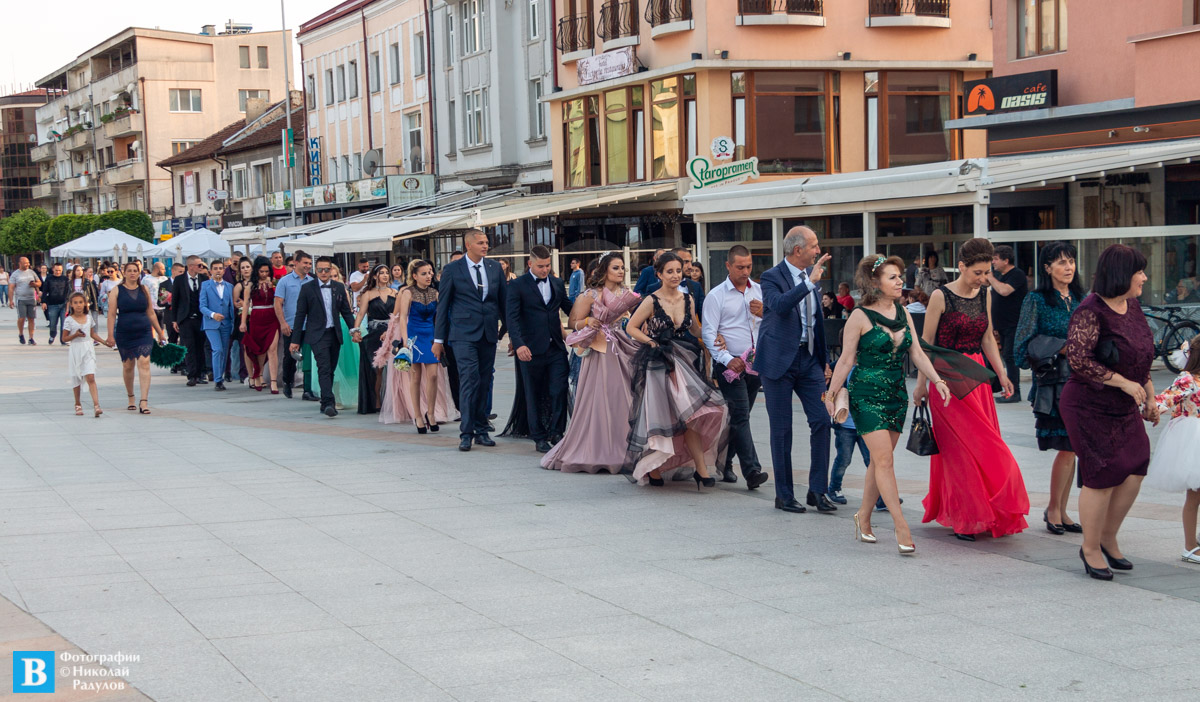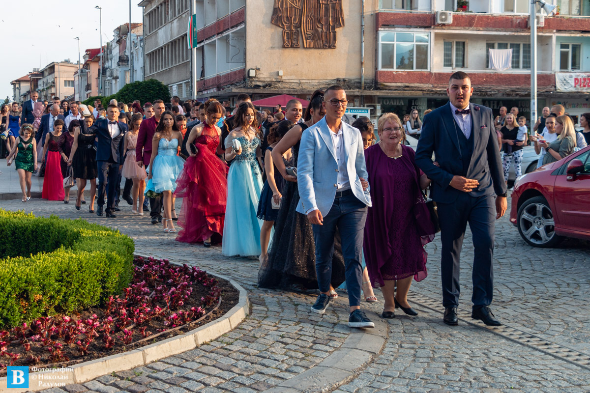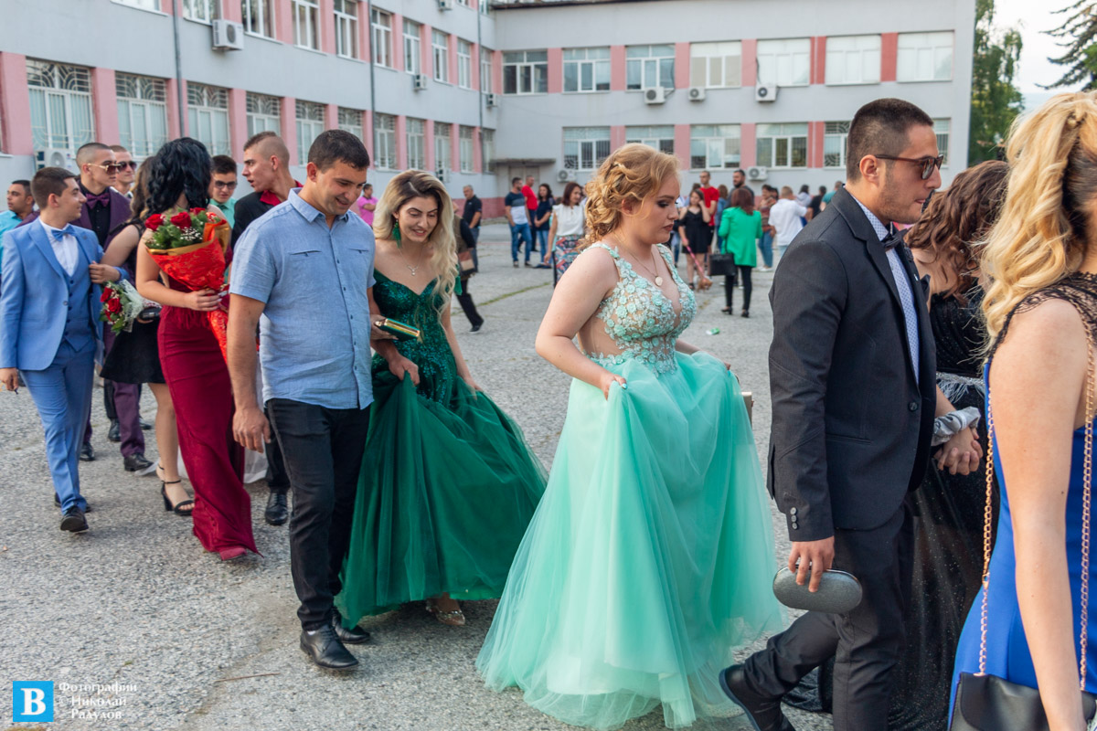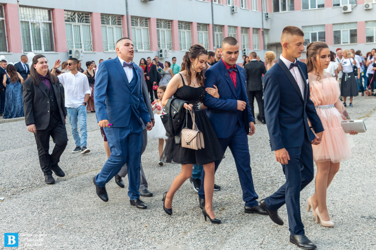 В 19,00 ч. зрелостниците се събраха в двора на училището, бурно аплодирани от близките си и приятелите си, както и от десетките панагюрци дошли да им се порадват.