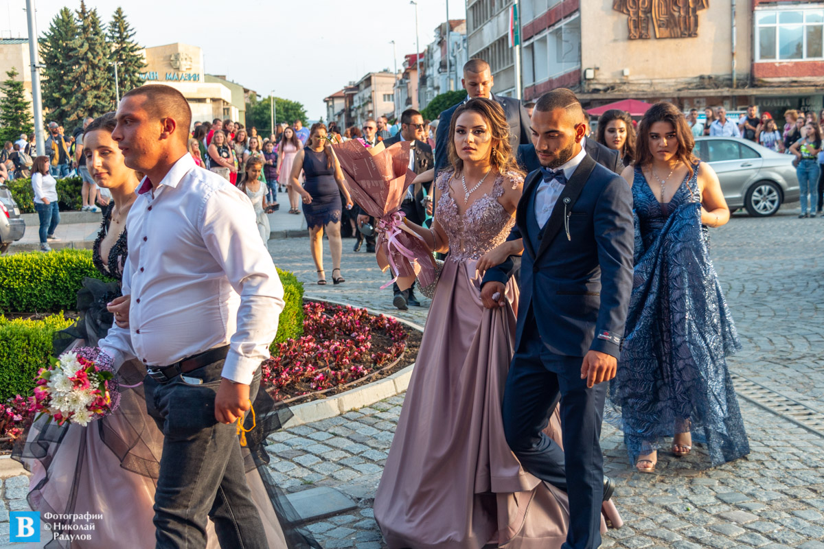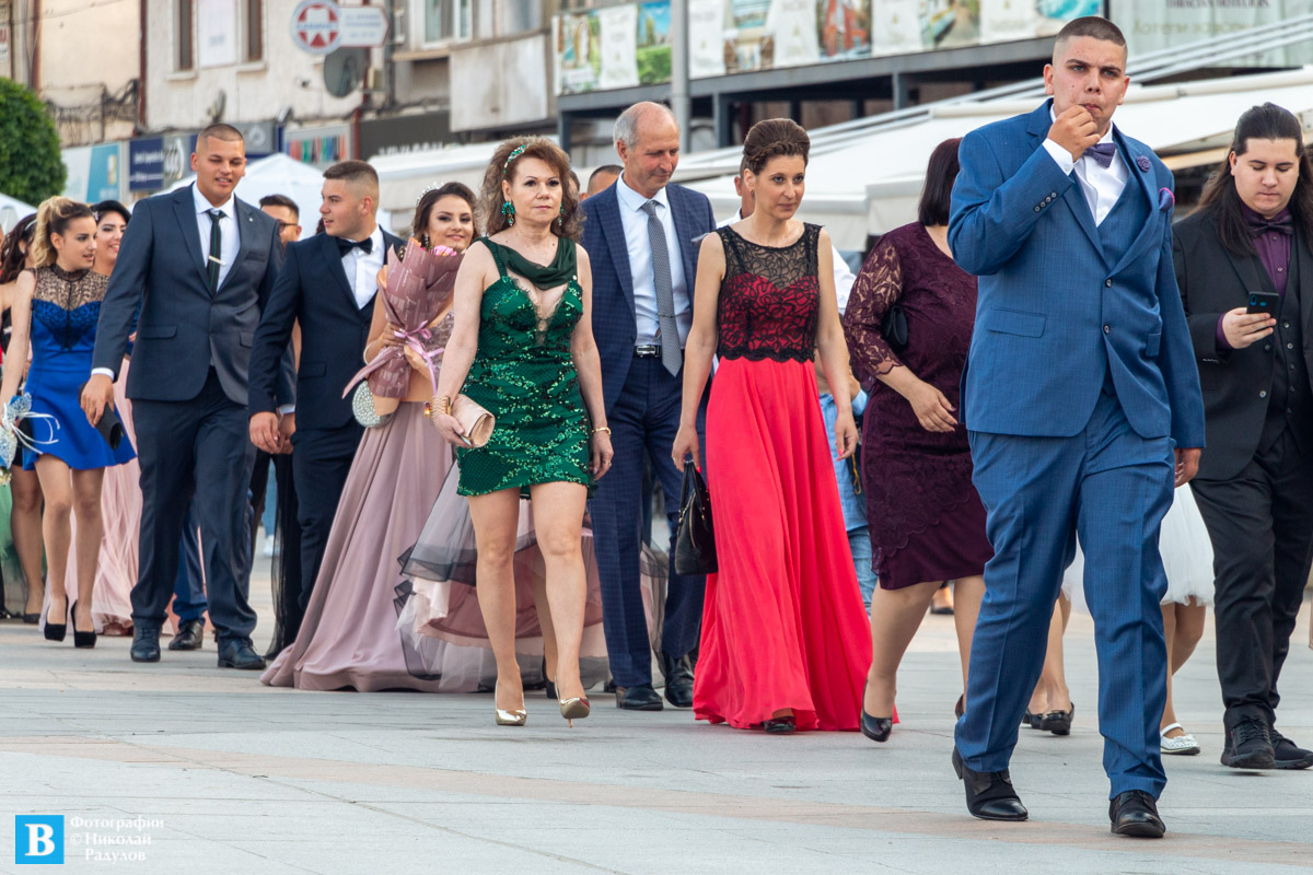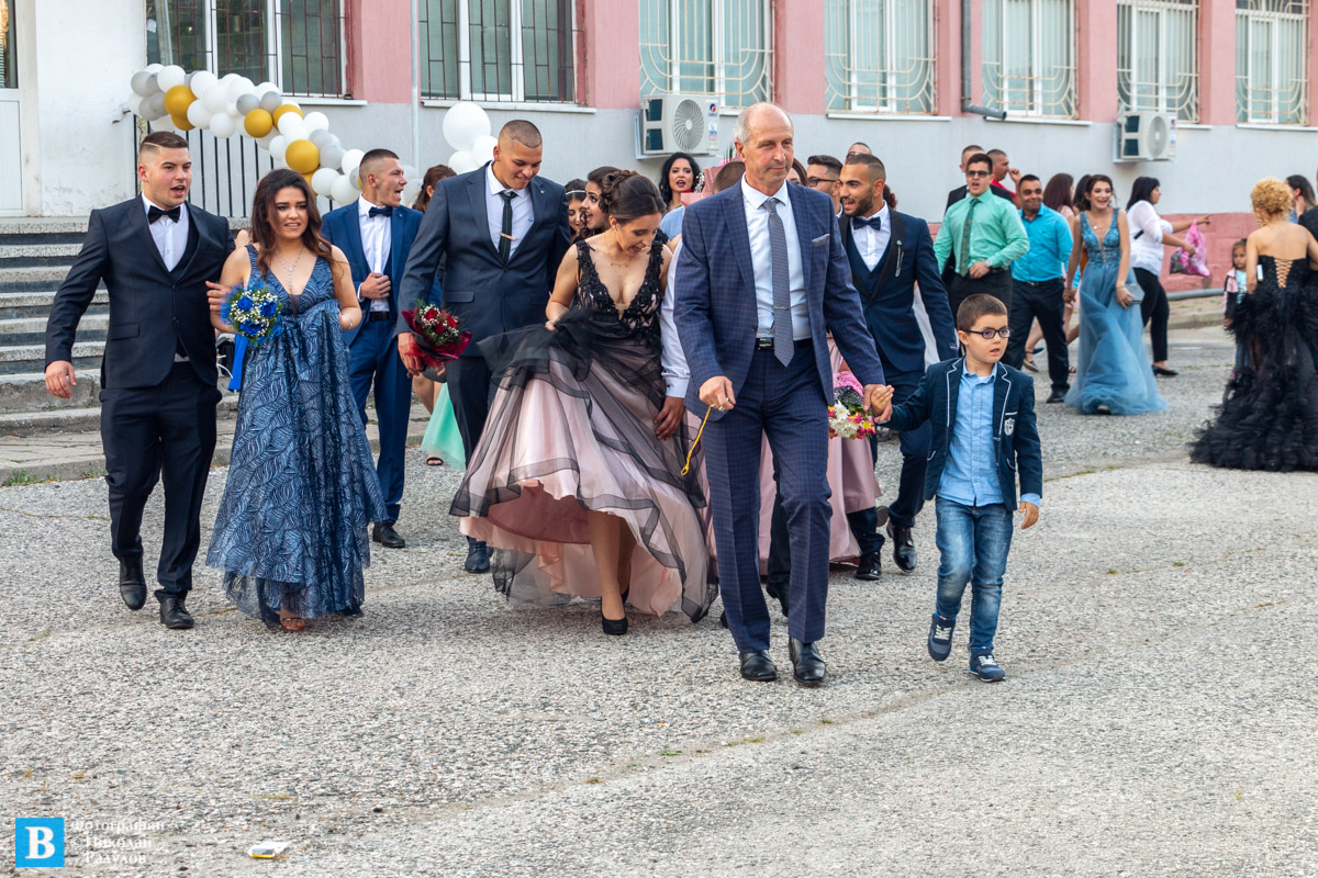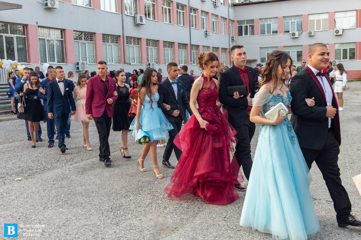 В 19,00 ч. зрелостниците се събраха в двора на училището, бурно аплодирани от близките си и приятелите си, както и от десетките панагюрци дошли да им се порадват.