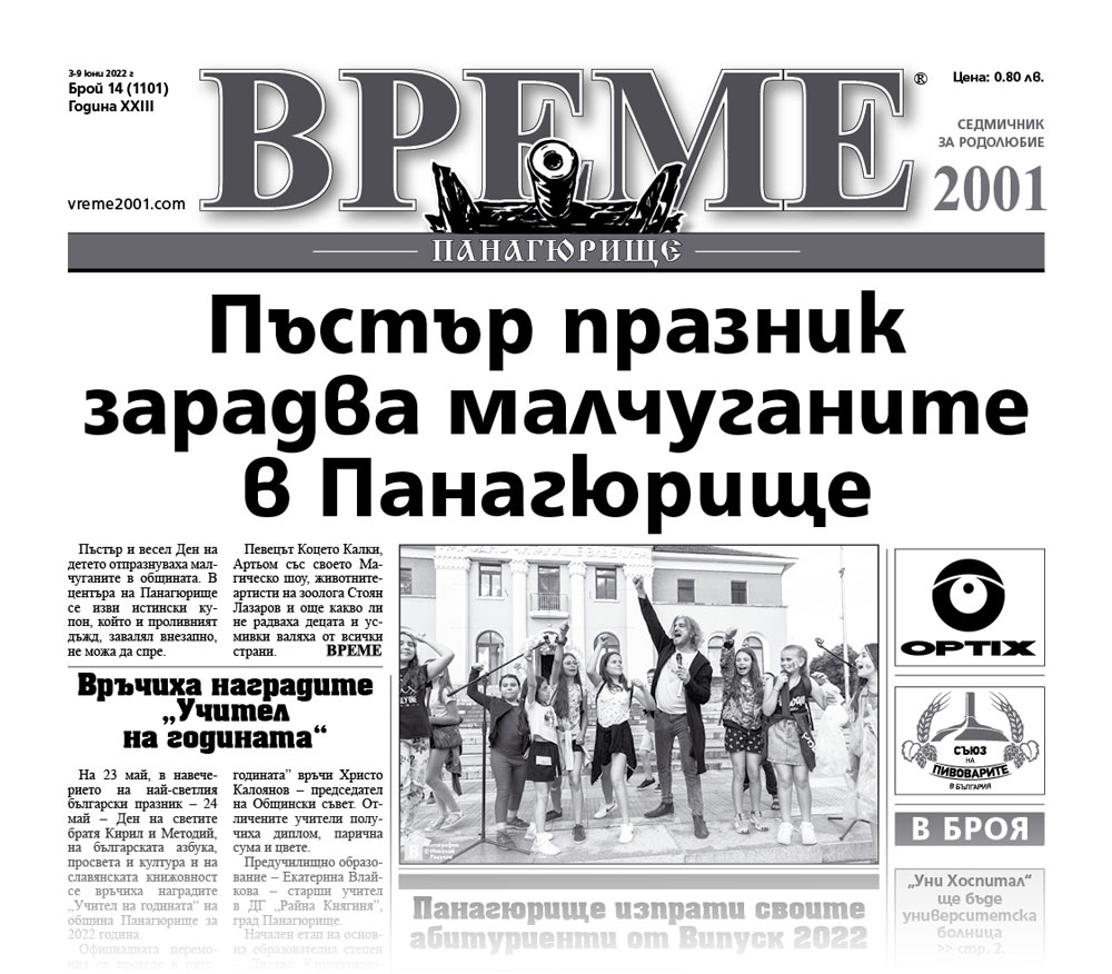Излезе от печат 14-ти брой за т.г. на панагюрския вестник „Време“. В него ще откриете актуалните новини от общината ни, а и още интересни теми. Ето някои от заглавията:
