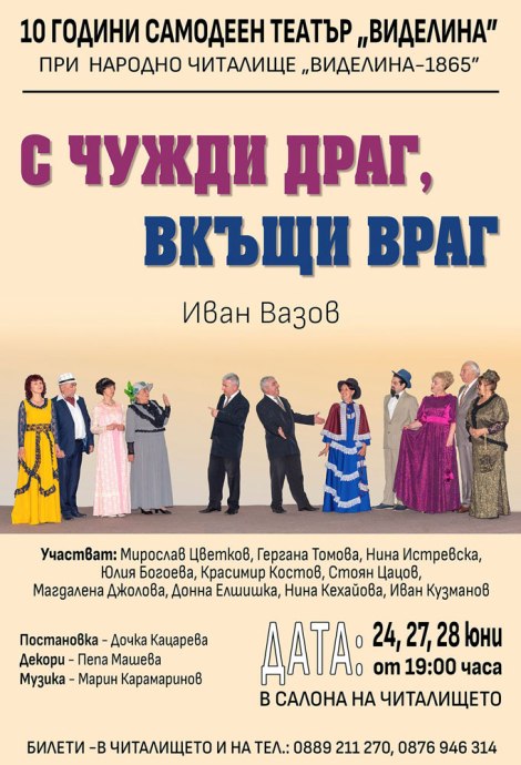 На 24, 27 и 28 юни, от 19:00 часа, в театралния салон на Народно читалище „Виделина-1865”, гр. Панагюрище, самодейният театър при читалището ще представи комедията „С чужди драг, вкъщи враг“ от Иван Вазов.
