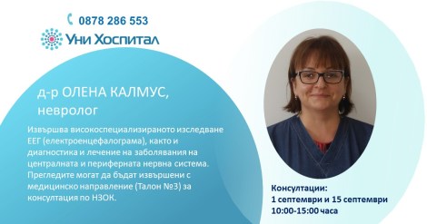 Д-р Олена Калмус, невролог и лекар в Клиниката по нервни болести на МБАЛ „Уни Хоспитал“, консултира пациенти в МЦ „Панагюрище“, който е част от МБАЛ „Уни Хоспитал“.