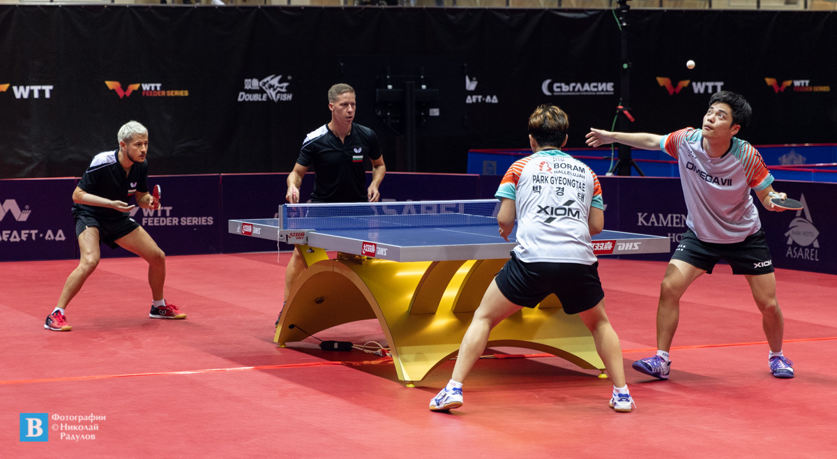 На двойки Денислав Коджабашев и Теодор Александров изиграха един от най-интригуващите сблъсъци през деня и бяха близо до изненадата срещу Парк Гьонтае и Чо Сюнмин от Република Южна Корея. Двамата българи изостанаха в резултата след 4:11 в отриващия гейм, но след това обърнаха развоя на срещата след много силна игра и 11:8 и 11:9. За съжаление на всички зрители в „Арена Асарел“ Парк и Чо бяха по-добрият тим в следващите две части и с 11:4 и 11:7 си осигуриха място в четвъртфиналите. Вторият български тандем Петьо Кръстев/ Йоан Величков беше надигран от французите Бастиан Рембер и Жул Ролан с 3:1 (6:11, 12:10, 8:11, 5:11).