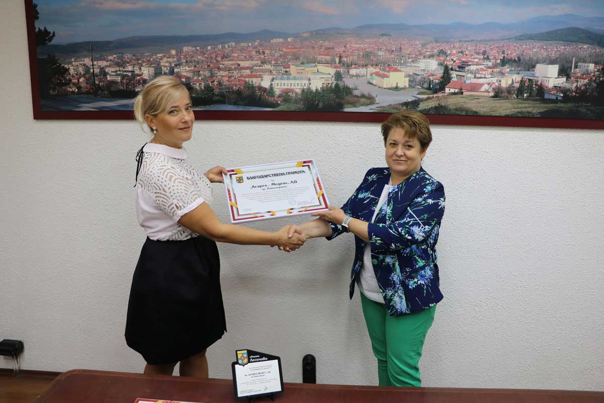 Грамотите бяха връчени на прокуриста на „Асарел-Медет“ АД Галя Костова от заместник-кмета на Община Лесичово Веселина Милкова, която благодари от името на всички жители на общината на компанията ни за „неоценимата помощ по време на бедствието“.