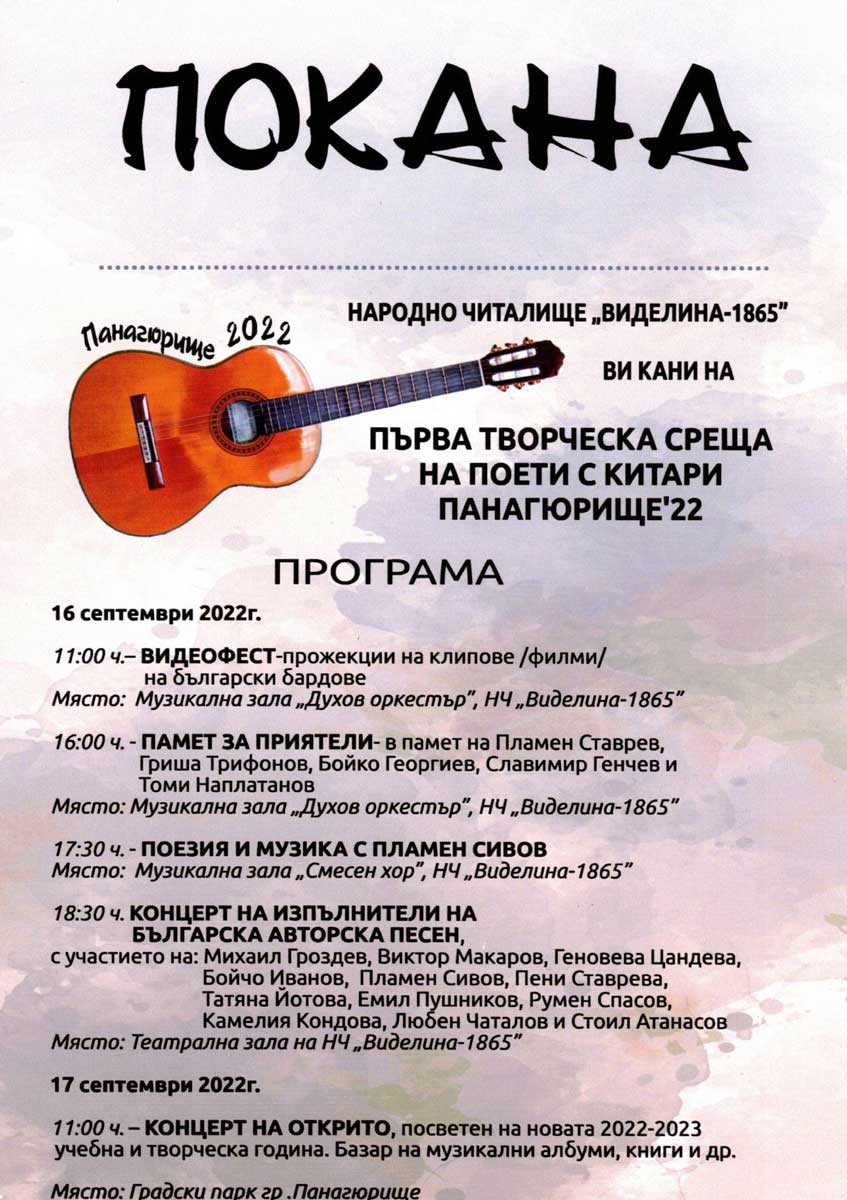 Публикувано на 12.09.2022 в 847 × 1200 в Предстои творческата среща на поети с китари „Средногорски струни, Панагюрище‘22“