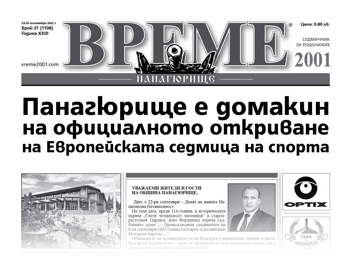 Излезе от печат 21-ви брой за т.г. на панагюрския вестник „Време“. В него ще откриете актуалните новини от общината ни, а и още интересни теми. Ето някои от заглавията: