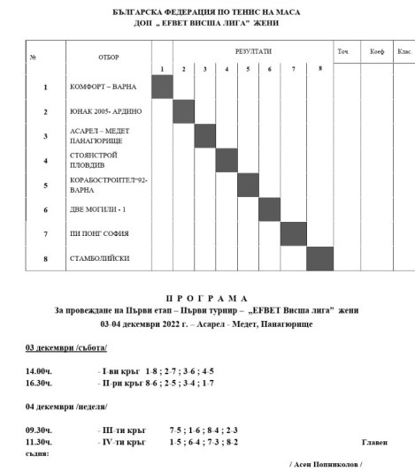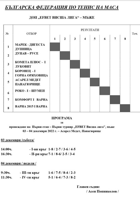Елитът на тениса на маса в България се събира тази събота в зала „Арена Асарел“. На 3 и 4 декември Панагюрище ще бъде домакин на първия кръг от държавното отборно първенство Efbet Висша лига за мъже и жени. Погледите отново са насочени към отборите на СКТМ „Асарел-Медет“, които и тази година са сред фаворитите за призовите места.