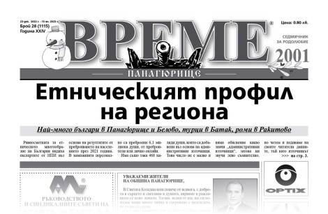 Излезе от печат и последният брой за 2022 г. на панагюрския вестник „Време“. В него ще откриете актуалните новини от общината ни, а и още интересни теми. А на последна страница ще откриете календар за 2023 година със снимка на паметника на местността Оборище. Ето някои от заглавията: