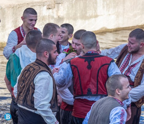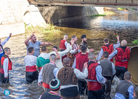 Под звуците на три гайди и тъпан, пеейки „Кой уши байряка“, облечени с народни носии, 21 млади родолюбиви панагюрци заиграха мъжко хоро във водите на реката.