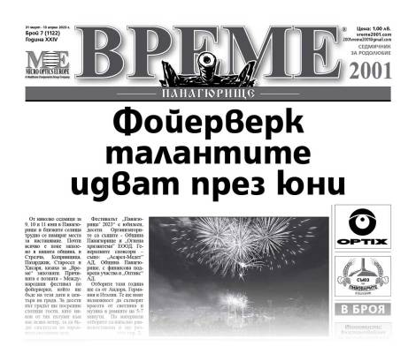 Излезе от печат 7-ми за 2023 година брой на панагюрския вестник „Време“. В него ще откриете актуалните новини от общината ни, а и още интересни теми. Сред тях са: