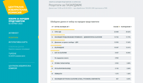 С 29.62% (22 848 гласа) подкрепа коалиция ГЕРБ-СДС печели изборите за народни представители в област Пазарджик. Втори са коалиция ПРОДЪЛЖАВАМЕ ПРОМЯНАТА – ДЕМОКРАТИЧНА БЪЛГАРИЯ, които получават 17.79% (13 722 гласа). Н трето място е Движение за права и свободи – ДПС с 17.62% (13 593 гласа). Четвърти са ВЪЗРАЖДАНЕ с 13.41% (10 347 гласа), а пети – БСП ЗА БЪЛГАРИЯ с 10.96% (8 457 гласа).