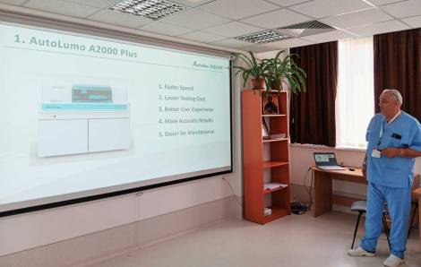 Д-р Васил Василев, началник на Клинична лаборатория в МБАЛ „Уни Хоспитал“, представи възможностите на новия напълно автоматизиран хемилуминисцентен имуноанализатор АУТО ЛУМО А 1000. Апаратът осигурява бързина, голяма прецизност на резултатите, удобство и лекота при работата и поддръжката, посочи д-р Василев и уточни, че в зависимост от изследването, то може да бъде извършено в рамките на 21-40 минути.