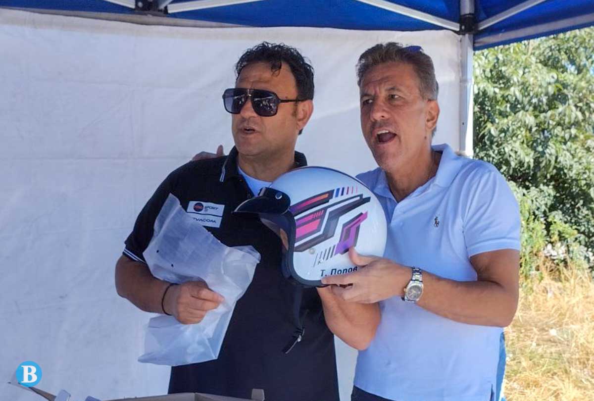 Публикувано на 10.07.2023 в 1200 × 810 в Илия Царски подари на кмета на Пазарджик Тодор Попов каска по време на рали „Бесапара“
