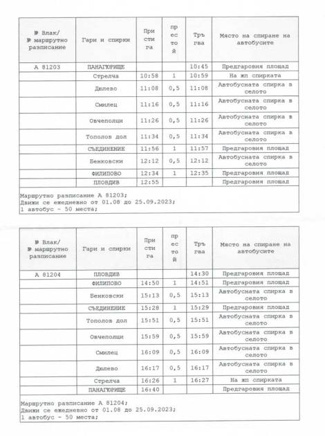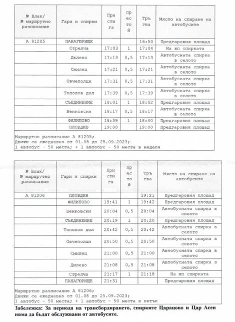 Поради ремонтни работи на Централно гара Пловдив и съгласно пуснати вътрешни заповеди и разпореждания на Д.П. „Н.К.Ж.И.“ се преустановява движението на влаковете по ж.п. линия Пловдив – Панагюрище за времето от 01.08.2023 г. до 25.09.2023 г.