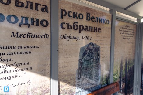 На отделни тематични пана са показани кадри от местността Оборище и паметника на Първото Велико народно събрание. Специално място е отделено на една паметна фотография – „Оборище. Кръстът паметник“, 10 юни 1907 г. На нея е документирана среща на останалите живи представители от Първото Велико оборищенско народно събрание през 1876 г., а в центъра на снимката е заклинателят на оборищенци поп Груйо. В отделни панели са поставени паметни думи на Захари Стоянов, Иван Вазов, Георги Бенковски, Васил Левски, наред с техни портрети, а също и портрет на местния въстаник Димитър Коклев.