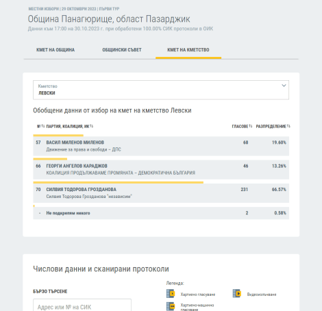 - с. Левски – Силвия Грозданова „независим“ – 231 гласа – 66.57%;