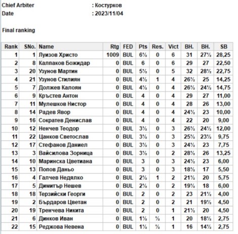 Първо място в генералното класиране спечели Христо Луизов. Второто място бе за Божидар Калоянов. Трето за Мартин Узунов. От дамите медали спечелиха Зорница Вайсилова – златен медал, сребро за Цвениана Маринска, бронз за Никита Тренчева. Наградите връчи президента на БСФШ GM Милен Василев.