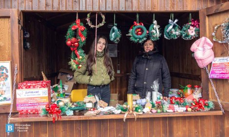 Посетителите на Коледния благотворителен базар могат да закупят традиционни коледни украси, ръчно изработени сувенири и дърворезбовани пана.