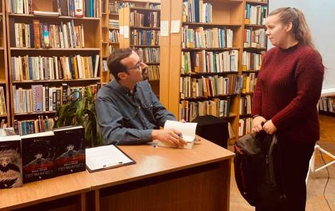 Васил Попов по професия е еколог, но и автор на разкази и романи, базирани на български митове и легенди. През годините творбите му са отличавани в редица литературни конкурси. Книгата му ,,Мамник” несъмнено се превръща в бестселър и е победител в Storytel Studio – първия по рода си конкурс в България за оригинален аудиосериал. В срещата с читатели в Библиотеката, водена от Стефан Рапонджиев, авторът сподели, че не поставя жанрови граници в творчеството си и обича да експериментира. Пише за нещата, от които лично той би се впечатлил, след прочитането им.