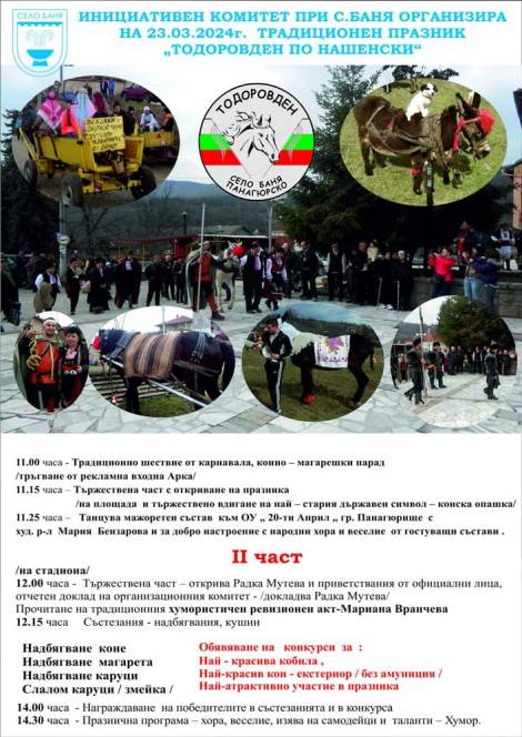 На 23 март, в Баня ще се проведе традиционният за селото празник „Тодоровден по нашенски“. Тодоровден, наричан още Тудурица, Лудото Тодорче, Конски Великден, конски празник, е винаги в събота, след Сирница и с него завършва Тодоровата седмица. Тази седмица е началото на големия великденски пост, отбелязващ края на зимата и началото на пролетта.