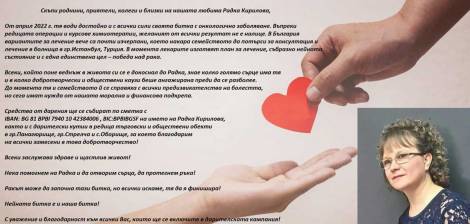 Радето се нуждае от сериозни средства за лечение. До момента тя и медиците се борят с лошата й болест, но са нужни още медицински интервенции. Радка е силна и убедена съм, вярва в добрия изход, както и в добрите сърца на хората. Вярват го и нейните близки, за които разходите за лечение в Турция са непосилни.