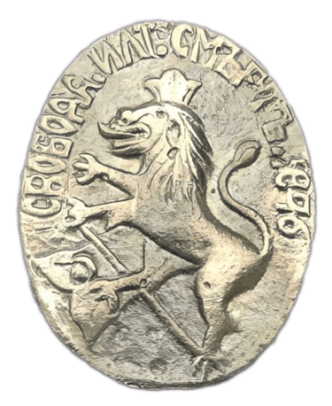 Лъв, изправен на задните си крака, с настръхнала грива и отворени уста. Под предните му лапи – полумесец със звезда – символ на неизбежното падане на Османската империя. Отгоре корона и букви в съкращение, съдържащо крилатата фраза „Свобода или смърт”.