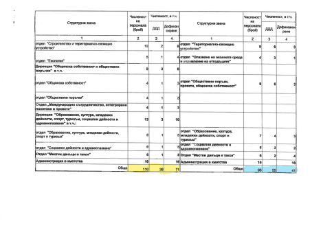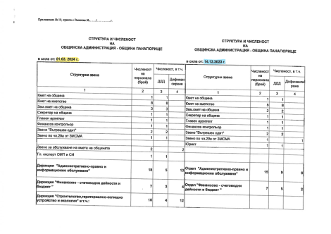 С приемане бюджета на община Панагюрище, считано от 01.03.2024г., е приета нова структура и численост на персонала на Общинска администрация (приложение №10 към бюджета), съгласно която: