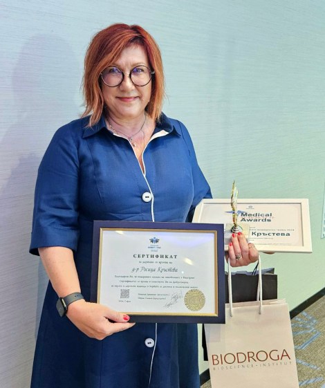 Д-р Росица Кръстева беше удостоена с приза “Най-добро качество в комплексната медицинска грижа“, който се връчва на лекар, предоставил на пациентите си качествена консултация и специализирани услуги. Критериите за високата оценка включват перфектна комуникация с други лекари, показваща гъвкавост, надеждност и ангажимент за изключителна грижа пациента.