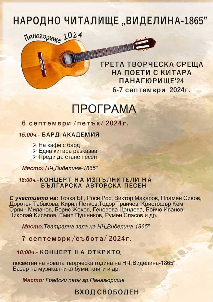 Публикувано на 04.09.2024 в 707 × 1000 в Трета творческа среща на поети с китари тези петък и събота в Панагюрище