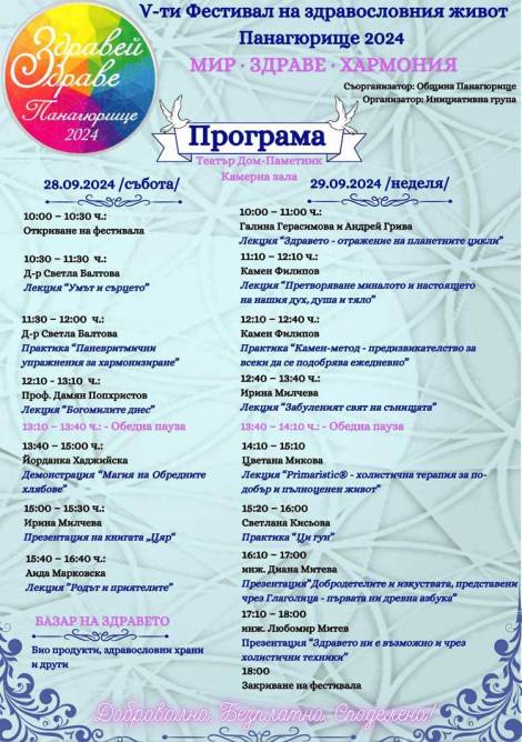 На 28-ми и 29-ти септември в града ни ще се проведе петото издание на Фестивала на здравословния живот „Здравей, Здраве!“, на който Община Панагюрище е съорганизатор. Целта му е да се популяризира здравословният начин на живот както във физически, така и в духовен план.