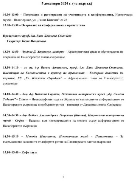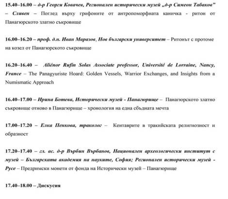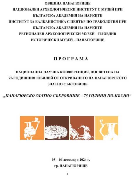 Национална научна конференция „Панагюрско златно съкровище – 75 години по-късно“, посветена на 75-годишния юбилей от откриването на деветте ритуални златни съда, ще се състои на 5 и 6 декември в Исторически музей – Панагюрище. Ето програмата: