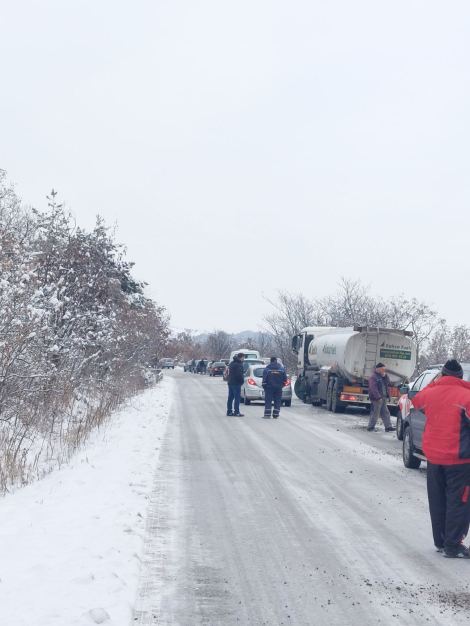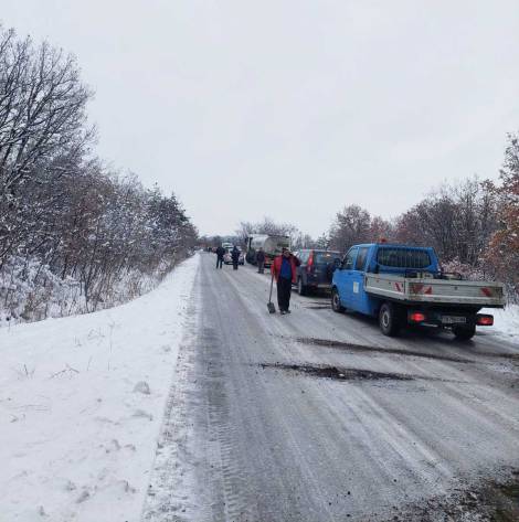 Голямо задръстване има на пътя между разклона за Бъта и Баня и Панагюрище в посока града. Заседнали в пътната тапа съобщават за няколко катастрофи, като за причина се посочва неопесъчения път. Хора, които са имали лопати в превозните си средства, са почнали да опесъчават сами с подръчни материали.