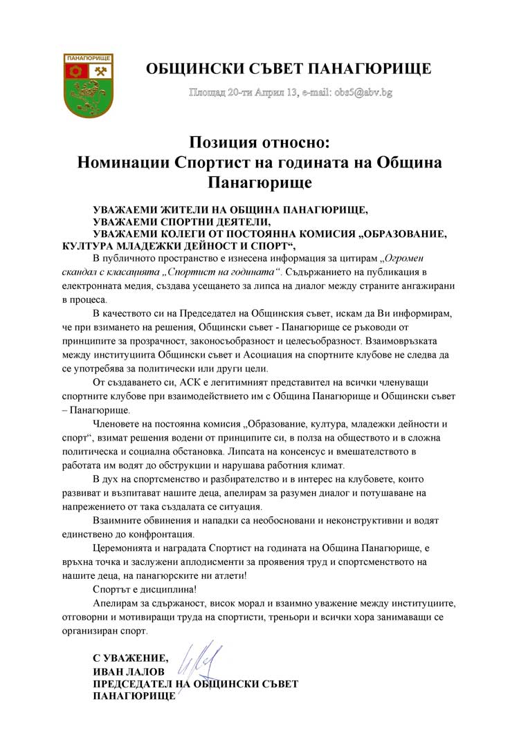 Публикувано на 27.01.2025 в 750 × 1060 в Позиция на председателя на ОбС-Панагюрище Иван Лалов относно номинациите за „Спортист на годината“