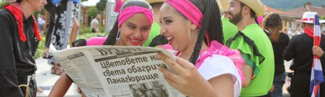 Танцьорите и музикантите от костариканскатта група „Kämuk“, които гостуваха на фестивала „Пъстър свят“, разгърнаха с интерес страниците на вестник „Време“.